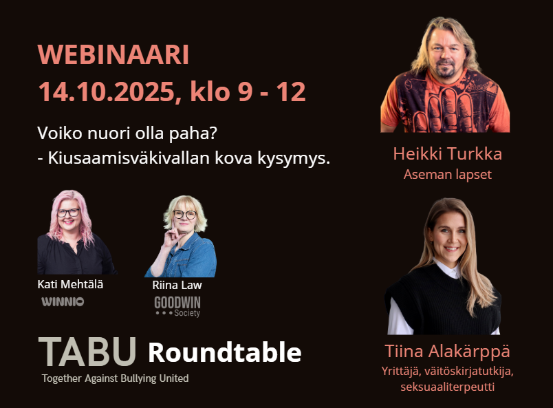 Tilaisuudessa esittelemme myös Tabu Roundtable -työn – uudenlaisen yhteistyömallin, joka kokoaa yhteen kiusaamisväkivaltatyötä tekevät tahot.